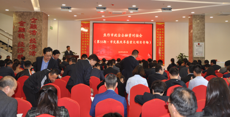 2019年4月17 日上午,焦作市政金企融資對接會(第33期?市發(fā)改委重大項目專場)在市智慧金融服務有限公司舉行,市投資集團有限公司副總經(jīng)理郭中強、建投公司董事長關玉紅參加會議。
